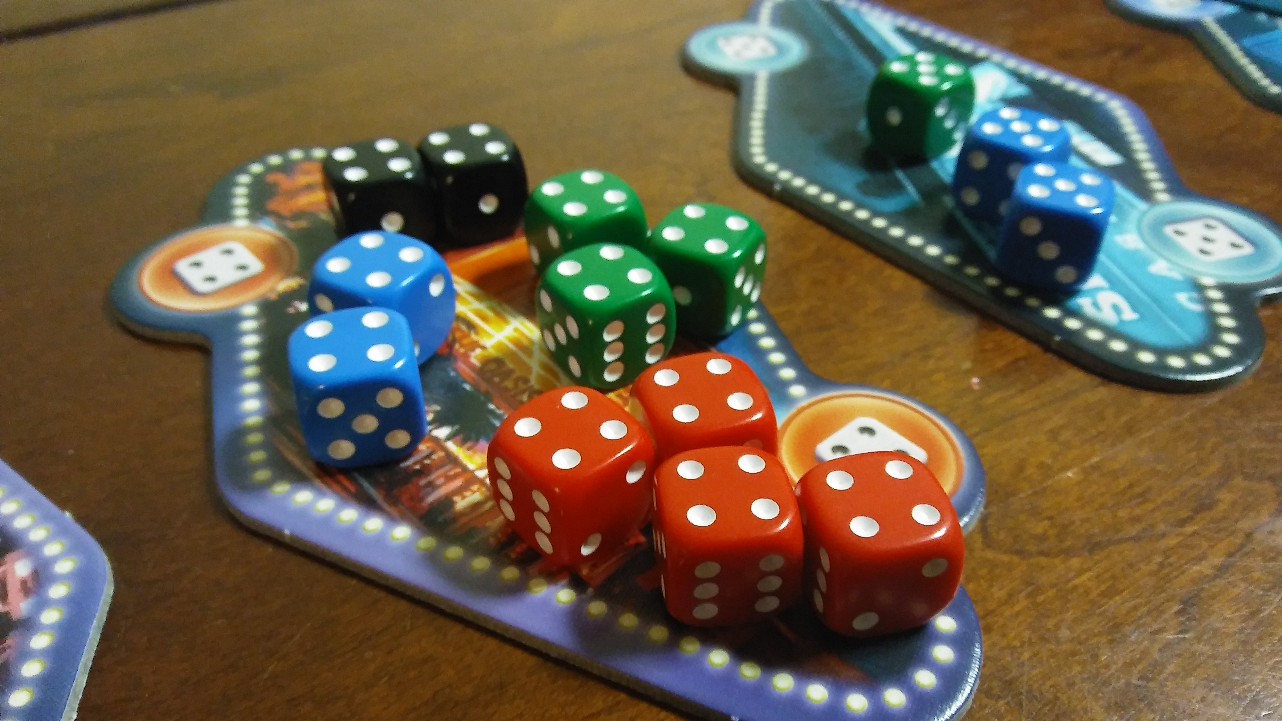 각 카지노에서 가장 많은 주사위를 올린 색의 플레이어가 해당 카지노의 보상을 가져갑니다.