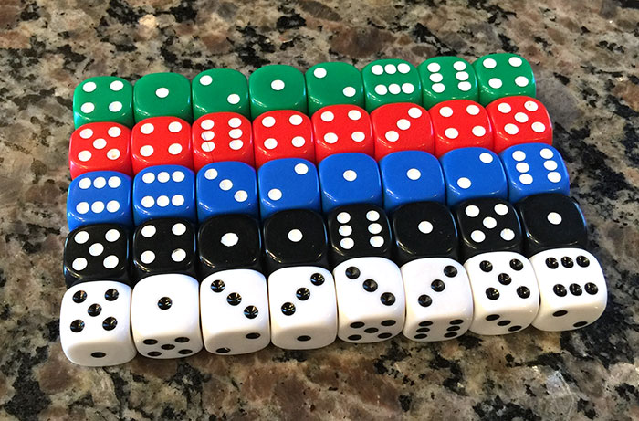 -게임 라스베가스의 핵심 기물은 이 '주사위' 입니다. 6면체 주사위로 눈이 1부터 6까지 표시되있는 일반적인 주사위입니다. 보드게임을 잘 접해보지 않았다면 보통 주사위는 '말'을 이동시키는 도구로 생각이 됩니다. 3이 나오면 3칸 말을 움직 일 수 있죠. 이게 일반적인 주사위게임에 대한 생각입니다만, 보드게임계에서 주사위는 생각보다 무궁무진한 바리에이션을 가지고 있습니다.